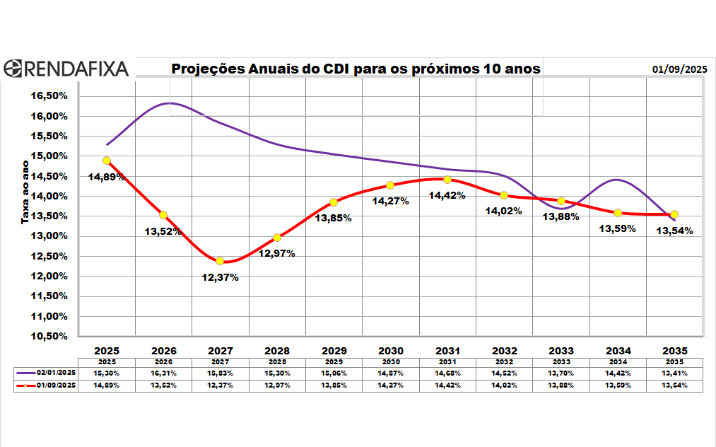 - A projeção de setembro de 2025 (linha vermelha) mostra uma revisão expressiva para baixo em relação à de janeiro de 2025 (linha roxa), especialmente nos primeiros anos.